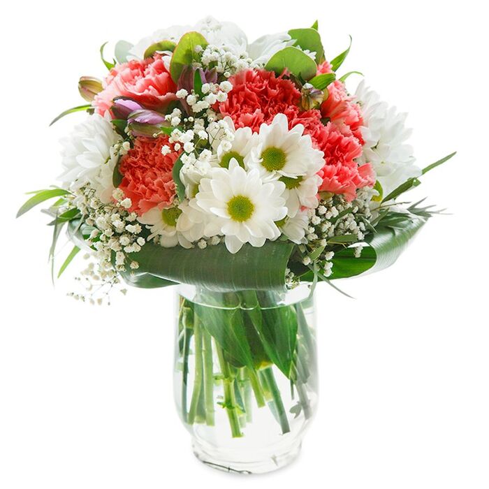 Experience the magic of nature with our Elegant Harmony Bouquet – a stunning arrangement that radiates grace and sophistication. This exclusive bouquet features a soft color palette composed of snow-white chrysanthemums, delicate gypsophila, and charming light pink carnations, all nestled among lush aspidistra leaves. Every flower is carefully hand-selected, ensuring exceptional freshness and a luxurious quality that transforms any setting into a celebration of beauty.